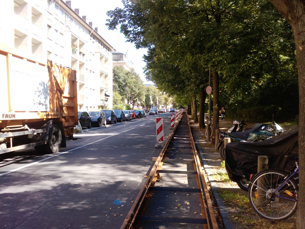 Was ist da los? Wird etwa die neue Straßenbahn schon gebaut, obwohl sich noch keine Bürgerinitiative dagegen gesträubt hat? Und dann auch noch mit einer Querverbindung zum Sanderring? So schnell? So unkompliziert? Nicht einmal der Ringpark ist in Gefahr?