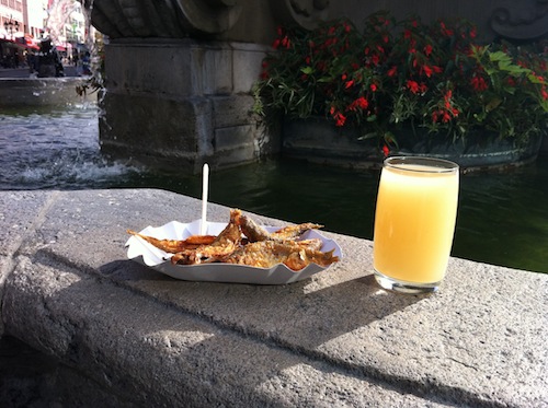 Gestern bin ich eher zufällig beim Traditionellen Fischmarkt der Würzburger Fischerzunft am Vierröhrenbrunnen vor dem Grafeneckart vorbeigekommen, wo wie jedes Jahr an einem Samstag im Herbst fangfrische und geräucherte Fische angeboten wurden. Das Besondere: In Fischwannen kann man sich den lebenden Fisch aussuchen, der dann geschlachtet, ausgenommen und verpackt wird. Auch frische Meefischli gab es und bei dem Anblick konnte ich nicht widerstehen und musste zugreifen. Durch perfektes Marketing konnte ich auch dem frischen Federweißen nicht widerstehen. Der Federweißer vom Weingut König in Randersacker war der beste, den ich in dieser Saison getrunken habe. Die Meefischli haben großartig geschmeckt. Beides zusammen im Sonnenschein genießen, einfach ein perfektes Frühstück.