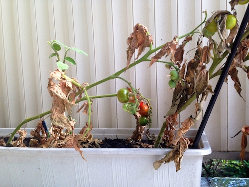 Wenn Ralf das Ergebnis seiner Tomatenzucht bloggt, fühle ich mich verpflichtet, das natürlich auch zu tun. Bei unserer Würzmischung mit den Stadtgärtnern im April haben wir beide Tomatensamen mitgenommen, Ralfs Ergebnis scheint mir da sehr viel erfolgreicher. Sein Strauch sieht auch schöner aus.